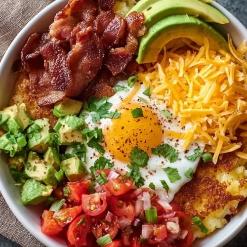 A hearty breakfast bowl packed with flavors and textures, featuring eggs, bacon, and creamy avocado, perfect for kickstarting your day.