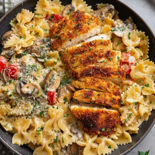 7. Plate Up: Slice up the crispy chicken and serve on top of the pasta, garnishing with extra Parmesan if you’re feeling indulgent.