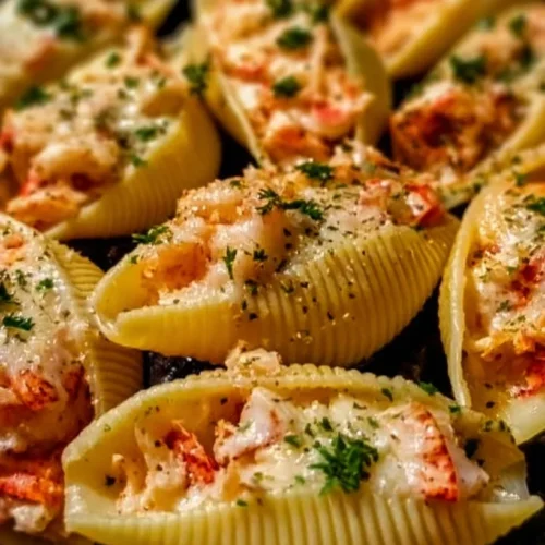 Delicious large pasta shells filled with a creamy seafood mixture of lobster, crab, and shrimp, all baked to perfection in marinara sauce and topped with cheese. A comforting dish perfect for any occasion.