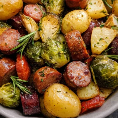 The combination of herbs, spices, sausage, and roasted vegetables creates a harmonious medley of flavors that warms your soul. As the food roasts, the natural sugars in the potatoes and Brussels sprouts caramelize, creating crispy bits that beckon you with every bite. It’s not just a filling meal; it’s one that fosters connection and contentment. With just a few ingredients and minimal fuss, it’s straightforward yet satisfying enough to impress. So go ahead, treat yourself to this humble yet beautiful dish.